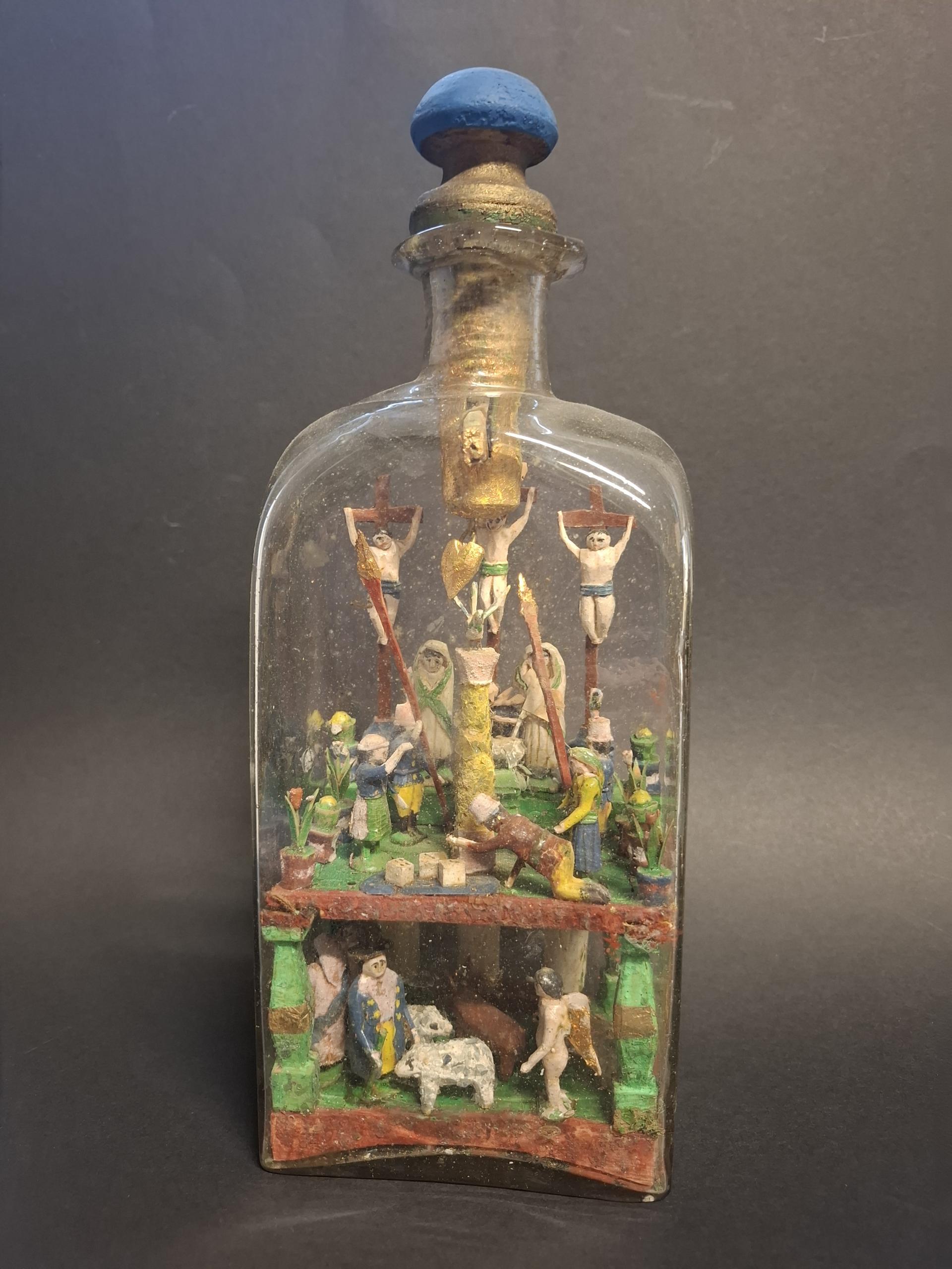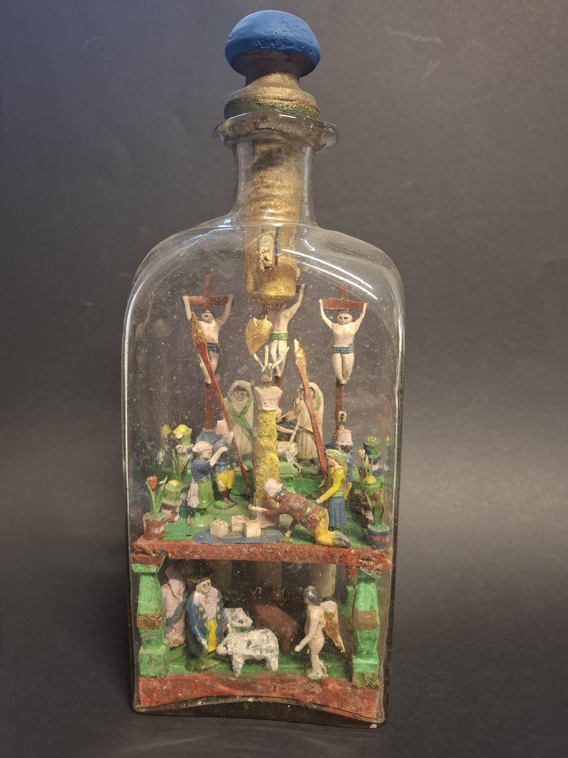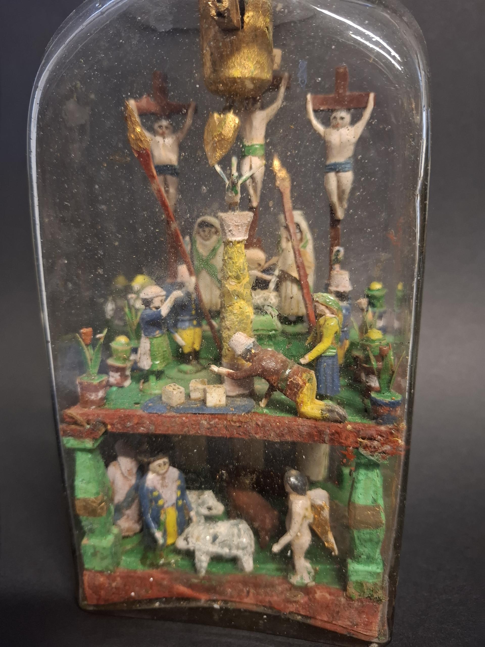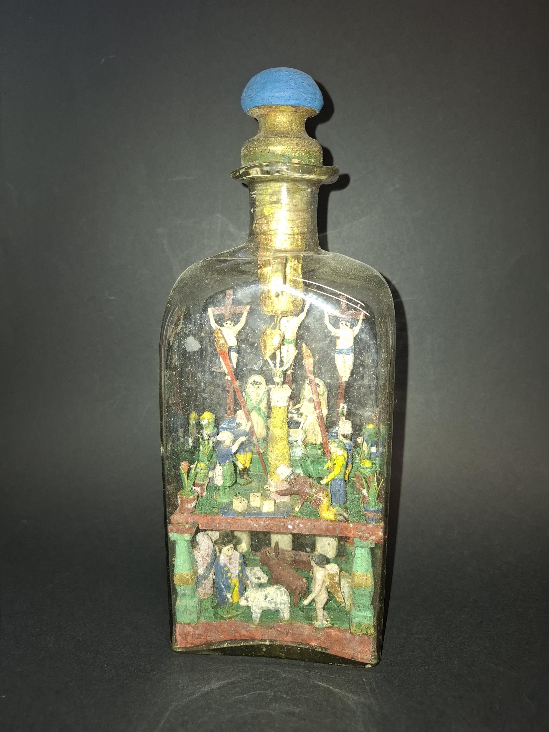 In der oberen Etage ist die Kreuzigung Christi dargestellt. Im Hintergrund sind 3 gekreuzigte Männer zu sehen, in der Mitte Jesus Christi mit der Inschrift INRI und einem Totenschädel mit gekreuzten Gebeinen am Kreuz. Links und rechts vom Kreuz stehen zwei Frauen, eine davon vermutlich Maria. Vor dem Podest mit den Gekreuzigten stehen Lanzenträger in bergmännisch anmutenden Gewändern, links und rechts der beiden stehen Tulpen. Im Vordergrund eine Säule mit einer Taube obenauf. Vor der Säule eine unbekannte Szene, 2 Frauen und 1 Mann spielen ein Würfelspiel. Die Geduldsflasche wurde um 1850 gefertigt und kam 1905 ins Museum.